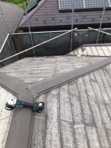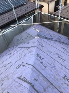 既存の棟、雪止めを撤去後、粘着ルーフィングをかぶせます。